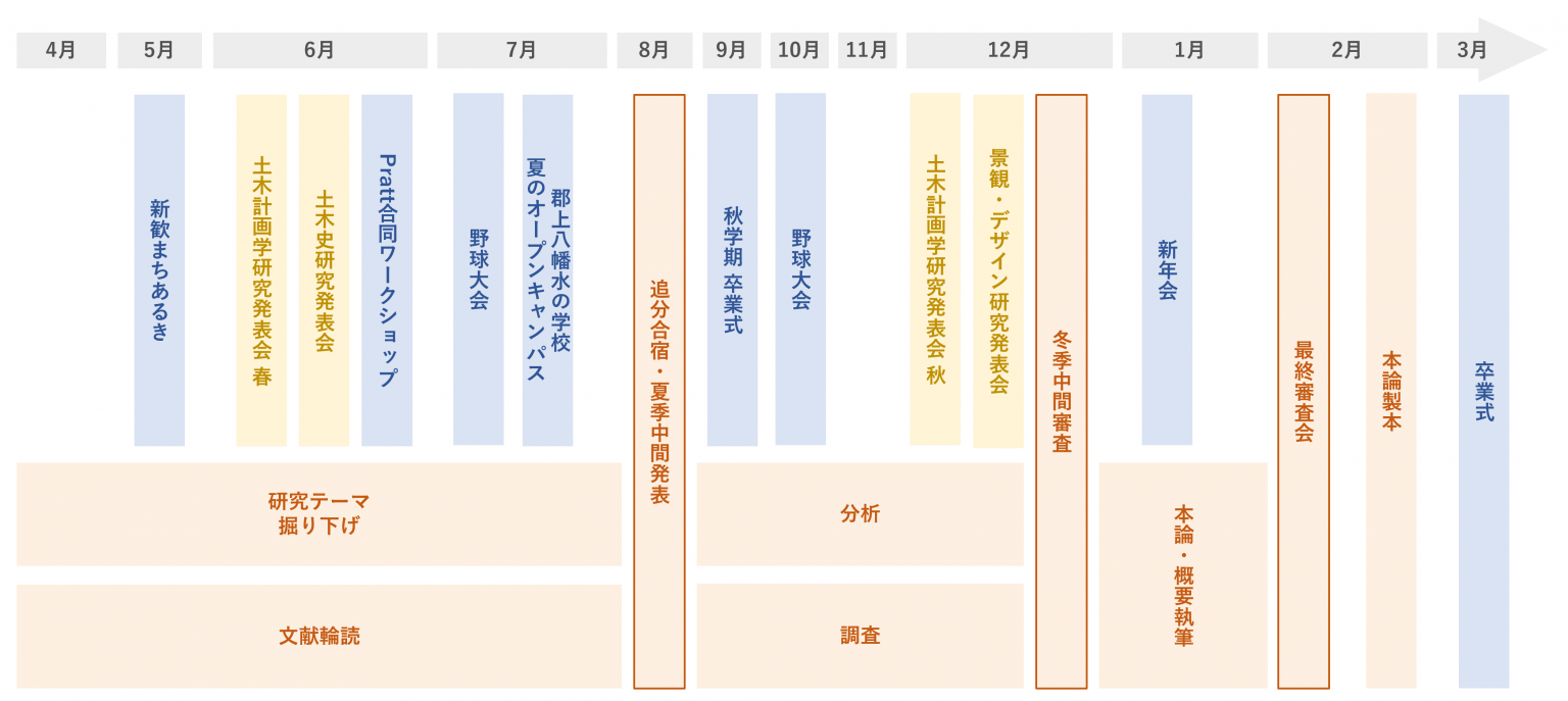 毎年、夏季(8月)、冬季(11月、12月)、最終(2月)の4回、合同で発表・審査会を実施しており、それに合わせて研究を進めていきます。B4の配属直後は、計画設計実習、GISゼミなど、統計手法について学ぶ機会が豊富にあり、スムーズに研究を始められます。また、研究が進んでくると、学会発表や論文投稿にもチャレンジします。研究以外にもBBQ大会、合同合宿などイベントも多彩で、年間を通じて充実した研究室生活を送ることができます。
